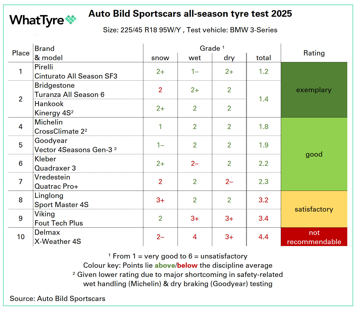 As a rule of thumb, the Auto Bild Sportscars test team believe all-season “can be the better winter tyre” for motorists who rarely encounter snow and ice. Compared with a winter tyre, all-season models provide “noticeably crisper handling and shorter braking distances in wet and dry conditions.” The testers add that the ten tyres in the 2025 all-season test have more in common with winter tyres than summer models, and for this reason they represent a “winter alternative” in regions where snowfalls are light and infrequent.